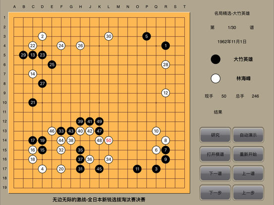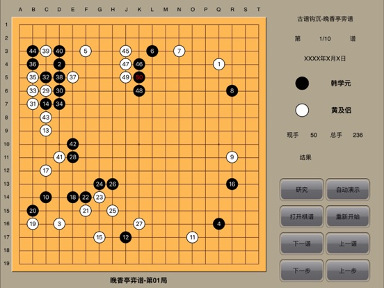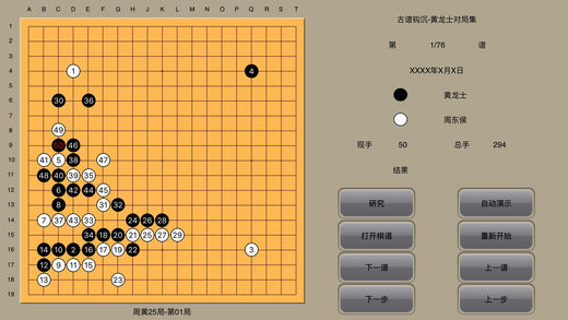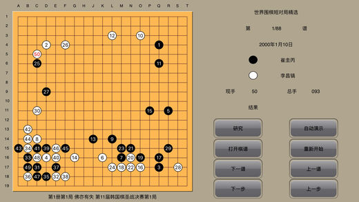 围棋天地(免费)已经上线,欢迎下载。 围棋经典收藏 (特色功能:自动演示、棋谱研究、个人棋谱保存) 目前收录: 古谱钩沉-兼山堂弈谱:62谱。 古谱钩沉-晚香亭弈谱:10谱。 吴清源布局:布局82谱。 吴清源名局精选:吴清源1933-1964对局56谱。 坂田荣男全集之10胜负师-怒涛时代:1951-1963对局33谱。 坂田荣男全集之11胜负师-称霸棋坛:1955-1967对局33谱。 坂田荣男全集之12胜负师-光荣轨迹:1951-1990对局43谱。 大竹英雄名局精选:1962-1985对局30谱。 百年经典围棋-从吴清源到李昌镐:1895-2003对局30谱。 聂卫平-人生九局:1974-1989对局9谱。 马晓春-笑傲纹枰:1991-1995对局12谱。 马晓春-黑白之间-12局败局反思:1996-2003对局12谱。 纹枰论道-迷你血战谱25谱。 古谱钩沉-黄龙士对局集76谱。 古谱钩沉-徐星友对局集19谱。 古谱钩沉-当湖十局10局。 古谱钩沉-餐菊斋棋评26谱。 古谱钩沉-玄妙道策21谱。 坂田荣男64冠历程201谱。 古谱钩沉-周懒予对局集60谱。 古谱钩沉-范西屏对局集16谱。 古谱钩沉-施定庵对局集16谱。 吴清源21世纪围棋下法28谱。 名家对局-梶原武雄108谱。 世界围棋短对局精选88谱。 47冠历程-加藤正夫136谱。 功能介绍: 打开棋谱: 选择打开某棋手的棋谱文件。 下一谱 : 从已经打开的棋谱文件选择下一谱进行演示。 上一谱: 从已经打开的棋谱文件回退到上一谱进行演示。 研究/复原: 中断演示过程进行打谱研究/恢复研究时中断的演示棋谱。 保存: 在研究模式下,对输入的个人棋谱进行保存。 个人棋谱:打开或删除已经保存的个人棋谱。 重新开始: 本棋谱回到开始状态。 下一步 : 单步演示下棋进程。 上一步 : 在单步演示和研究模式下棋进程时回退一步。 自动演示:自动演示下棋进程。随时点触任何有效键即可结束自动演示。 (自动演示速度:极慢:间隔3.0秒。慢速:间隔1.5秒。 中速:间隔1.0秒。 快速:间隔0.5秒。) About WeiQiJingDian WeiQiJingDian collects a lot of games played by Chinese and Japanese ancient and the present age top players. Function: Open: open one player played games. Next Game: from the game to next. Prev Game: back to the prev game. Next Step: from the step to next. Prev Step: back to the prev step. Restart: restart the game. Auto Demo: auto demo the game, press any button to stop. Self Play: press the button, by touch the screen, you can study the games. Back: return to the game before Self play is pressed. Save: once you enter the game, press Self Play, by touch the screen, you play the game your self, after finished, you can save the game as your private collection. Private: open your private collection.