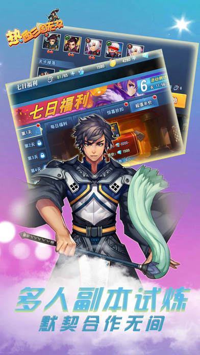 游戏介绍: 2017年最受期待的三国题材军团争霸策略手游《热血三国无双》现重磅来袭!数百名武将战场争锋,动态小兵组词最强军团霸道厮杀!兵种互克,玩出心机,拒绝无脑操控!为了军团之争,荣誉之战,看准时机,指尖招招绝杀!百人同屏团战,火力全开杀伐天下,群雄逐鹿中原谁能登极巅峰!卡牌动作策略烧脑手游,搭配顺滑流畅的操作,高清无暇的战斗场景画质,让战斗更加狂爽! 游戏特色: 历史神将再临,骁勇征战沙场 ——三国时代武将悉数登场,招募升级武将,提高技能,为您出谋征战,夺取最终的胜利! 真人热血对决,智计运筹帷幄 ——真人爽快实时战斗,智计决斗运筹帷幄间,让英雄有用武之地,让强者不再寂寞,体验无限可能性的对战! 策略变化多端,军团群雄夺冠 ——三国势力四方来袭,军团群雄开启乱世时代,为了军团荣誉,搭配不同的策略,逐鹿中原登极巅峰。 多人副本试炼,默契合作无间 ——选择喜欢的武将小兵组合,配合队友闯副本击杀boss,默契配合其乐无穷。