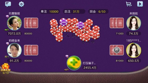 炸金花 抢红包 人人玩炸金花 人人玩棋牌 人人玩三张手机版是一款棋牌类休闲游戏,史上最专业最富人气手游;人人玩三张手机版阵容豪华,高手云集,挑战智慧与运气的极限。本站提供人人玩三张官方下载。 2017年火爆的棋牌游戏:给你专业、公平、好玩的游戏体验。更有百人同场对战,惊险刺激玩不停~ ---百万用户,百万金币--- 百万用户在线,多种玩法让你爽到high,$1000000游戏币等你来拿! ---真实场景再现--- 模拟超真实现场体验,豪华场景,性感荷官等你来。 ---无作弊--- 顶尖的防作弊技术,随机配桌自动开始,告别选房间痛苦。 ---免注册,立即玩--- 轻松快捷,免注册免登陆,游客玩家马上玩 ---在线陪玩--- 百万用户在线陪玩陪聊,做人生赢家 ---除更多的游戏特色--- 简单刺激的玩法助你成为风云之王,一场拼运气斗胆量的内心大戏,感受牌场的嗜血厮杀氛围,豪华8大场景等你开启,轻松享受无限挑战,金币领到手抽筋,各种道具让你玩的更有派头血拼更爽。