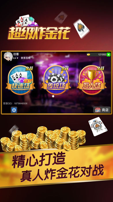 炸金花又名扎金花、诈金花,也俗称赢三张、三张牌,游戏每天免费发放多次在线奖励金币、大量救济金,供玩家尽情下注,肆意狂欢。 炸金花在线简介: 炸金花在线游戏集传统炸金花和万人场炸金花体验于一身,让玩家免费体验一把成为大富翁。 游戏特色: 1、游戏每邀请一位好友参与可获100000金币,成为VIP玩家每天登陆都可领取工资,最高每天可领取150000金币,同时可获得VIP权限,以及增加好友上限。 2、万人场牌局体验一把成为超级大富翁的快感! 3、集多种玩法于一身的游戏大厅,让你身临炸金花电玩城中,享受炸金花经典街机的无穷刺激。