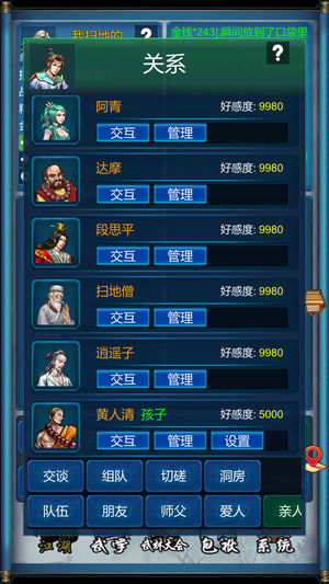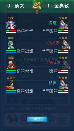 您扮演一位16岁初入江湖的少年。一开始您只有2000金币和5000的武功,可能会遭遇恶人下生死状,或者被人暗算身中剧毒,也可能遇到良师益友与您并肩作战。 只要您勤学武功,克服困难,您终将成为一代大侠! [概况] 您可选择去各大门派游历,途中可能遭遇各种突发事件。 请量力而为,约战武力较低的对手,以在下一轮战胜他,获得对方的金钱和武林秘籍。 得到武林秘籍和足够的金钱,您就可以好好修炼武功了。 江湖险恶,请注意照顾好自己,有病吃药,毕竟身体健康才是最重要的! 您大约能活到60岁左右,请珍惜每一天,好好奋斗。 [江湖] -战斗 属性系统、战斗系统 战斗基于攻击、防御等战斗属性,支持多阵营战斗 血…