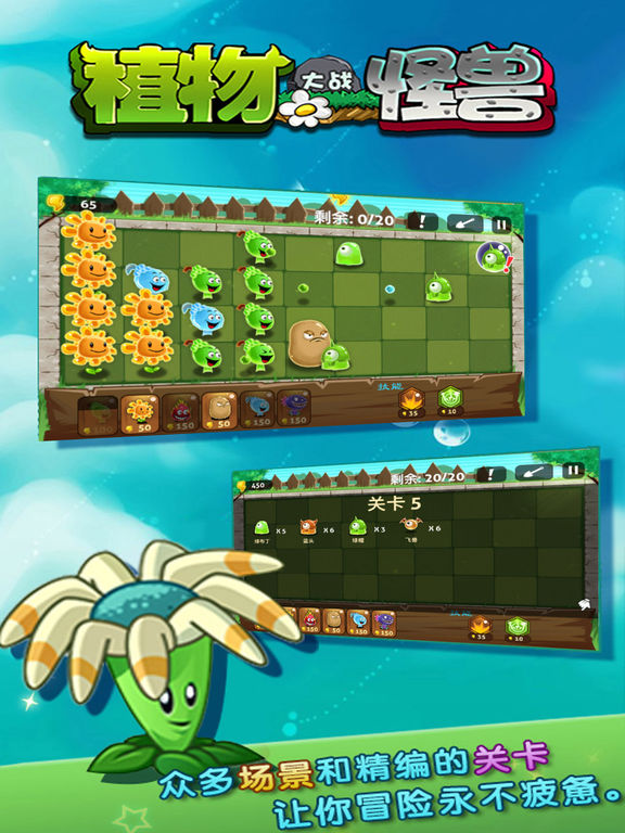 《植物大战怪兽》是史上最火爆的塔防游戏力作!植物军团再次发力,超强精英植物卫士,配备最新植物科技,陆空全方位战略性封锁战线,将所有小怪兽阻挡在入侵的道路上! 3大主题场景,多个可选关卡,张牙舞爪的小萌怪兽,超强力英雄伙伴随时支援,更有陨石雨、雷暴、万里冰封等酷炫助力,带你超神带你飞!快和向日葵大大并肩作战,抵御怪兽军团的入侵吧!
