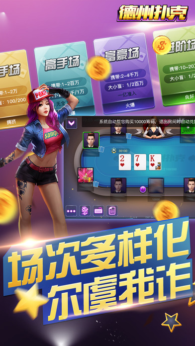 德州扑克大师俱乐部,粉丝必备! 天天大奖赛,万人在线PK,超多豪礼等你来拿! 游戏特色: 1,登录就送大量游戏金币,玩牌更能获得土豪大奖! 2. 玩法丰富多样,经典玩法、懒子玩法。还有更多其它小游戏刺激惊险,爽翻天! 3. 游戏画面精美简介,豪华的视觉体验,真实的拉斯维加斯感受! 4. 专业顶尖的防作弊系统,让你感受公平,公正,公开的高手对决! 5. 单手操作,让你无时无地都能畅玩PK,还有真人美女陪你来玩。 提供各种在线博彩娱乐,旨在为每位用户提供快捷舒适和安全的娱乐体验,轻松赚钱!真人在线德州扑克震撼来袭!全球最火的德州扑克游戏,让你走向无限乐趣! • 24小时真人美女在线,邀请你的朋友一起和美女扑克手对弈,随时随地享受你们的扑克之夜。 • 正宗拉斯维加斯体验–德州扑克、jackpot等更多免费游戏等你来。 • 黑衣人匿名模式—全网唯一提供匿名模式德州扑克游戏,所有游戏数据为您隐藏,享受真正匿名体验,再也不怕不好意思赢小伙伴们的钱啦 • JACKPOT上亿奖池—完全免费,只要玩牌就能击中jackpot奖池赢取筹码。 享受您的德州扑克之夜同时,我们期待您的反馈!