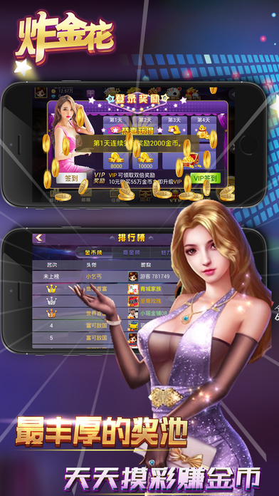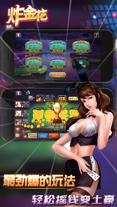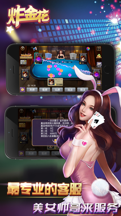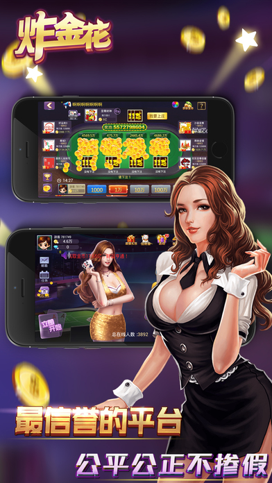 《炸金花全民版》 是一款传统炸金花纸牌游戏的网络升级版。 ●游戏特色: 1.每日登陆,享受欢乐炸金花,免费领取阶梯等级金币,循环赠送,财源不断。 2.每天多次、免费赠送超额金币,快乐炸金花,人性化金币支援,暖意浓浓。 3.摇钱树每天摇钱赚金币,长期可靠,疯狂炸金花,金币滚滚,不要错过哦。 4.天天摸彩金,豹子出不停,真钱炸金花,赚到你~~怀疑人生~~。 5.靓女帅哥 满场随意交流,真人炸金花,弹幕炫酷聊天,欧巴来聊吧。 6.天天拼拼乐,随时翻翻乐,全民炸金花,在线有豪礼,分分拿奖励。 《炸金花全民版》民间又名,诈金花,扎金花,砸金花,咋金花,金花,拼三张,赢三张,飘三叶,是传统纸牌游戏发展而来的比拼智慧,相互博弈的益智类娱乐游戏,茶余饭后,消磨时光,以牌会友。 ●温馨提示: 各位玩家朋友:适度游戏有利身心健康,切勿沉迷! ●炸金花全民版 客服QQ群:94300876