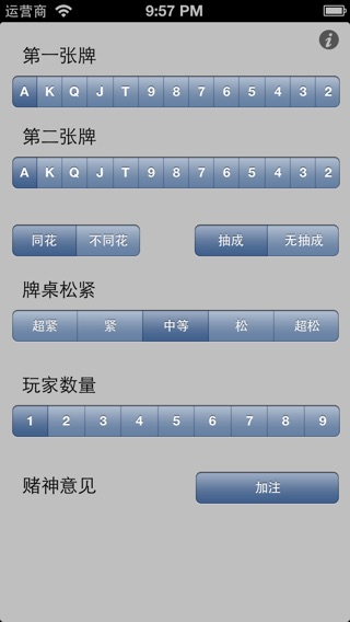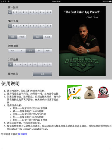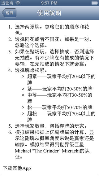 “学习德州扑克最好的软件!” —— Michael The Grinder Mizrachi 您有多了解德州扑克的概率?您肯定知道一对A是好牌,那麽一对二呢?89同花呢? 您知道一对2从概率上讲在4个玩家的时候是烂牌,在6个玩家的时候就是好牌吗? 您知道98同花在有抽成的赌场里只有6个人以上才是好牌吗? 《德州赌神》揭示了德州扑克里令您耳目一新的概率统计。统计结果基於130亿的牌局模拟计算。专门为初学者设计,但是所有等级的牌手都可以从这些概率里受益。- 只要您根据统计结果弃牌,您将会赢更多的钱! pokerincome.com