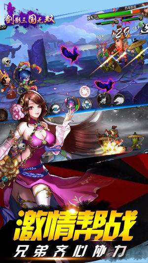全新三国创新演绎,推翻正统卡牌玩法,策略布局实力对决,引领三国卡牌次世代新风尚!来《剑影三国无双》,在小酒馆招募经典人气武将,熟悉的Q萌三国英雄,羁绊英雄大作战,酷炫技能随意释放,绚丽特效的剑影浮空连击,跨服决斗登顶巅峰,强大的战斗连招套路,还有地图夺宝等多样玩法,让你爱不释手!经典题材,全新展示,给你不一样的指尖刺激体验! 游戏特色: 【招募最强武将,策略统帅八方】 三国武将跨时空再现,百余名武将属性技能各异,Q萌貂蝉,帅气子龙,霸气吕布,个性武将跃然于屏,套路组合策略布局,为你征战八方统领三国! 【集结帮派伙伴,为帮派荣誉而战】 定时完成帮派副本任务,携手挑战boss,帮派PK…