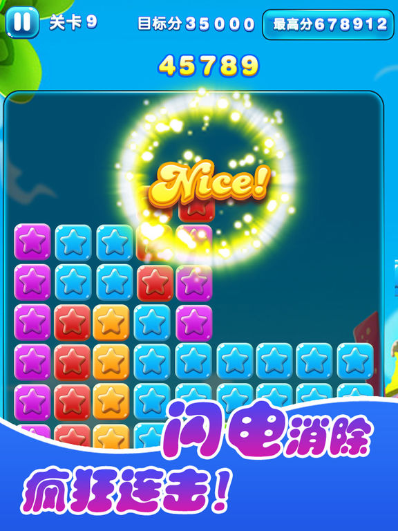 星星消消乐,体验经典消星星和爽爆新玩法的乐趣 游戏亮点: 保持经典核心玩法,重新设计界面,给你梦幻甜美的全新风格、丰富有趣的音效、畅快淋漓的手感,带给玩家最高品质的消除体验; 新增连消爆爽玩法,令人上瘾的超快体验!你能引爆多少颗星星呢?数百关卡+炫酷道具,每局都让你感受如闪电般无比刺激的游戏体验!