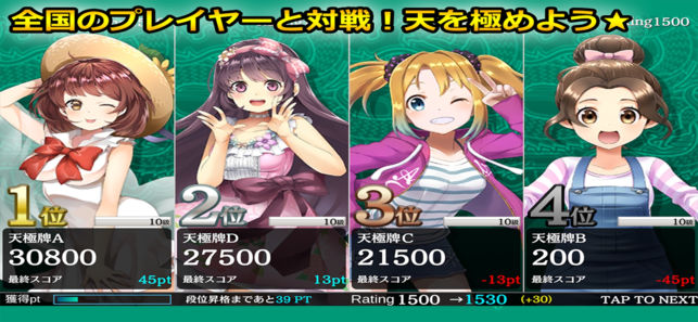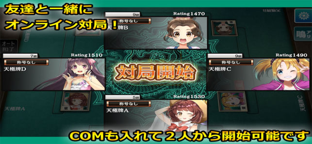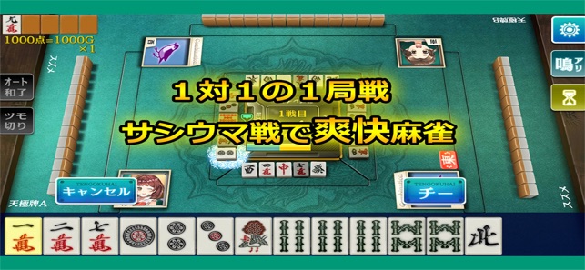 ■麻雀 天極牌 ~誰でもすぐに楽しめる!オンライン麻雀ゲームの決定版~ 「麻雀 天極牌(てんごくはい)」は、初心者から上級者まで、一人から麻雀を手軽に楽しめます。「四人麻雀」だけでなく「三人麻雀(三麻)」も! 充実したルールオプションも完備した本格麻雀アプリです。 ■初心者でも安心アシストで快適麻雀! 牌をタッチするだけで対局が進行!サクサク遊べます。 ドラ牌は色がつきわかりやすく!点数計算など、難しいところは完全サポート! 遊んでいるうちに、自然に麻雀ルールを学べます。 ■サシウマ戦で爽快麻雀! 最大の特徴は、1回3分から遊べるサシウマ戦モード! ちょっとした待ち時間などに、サクッと麻…