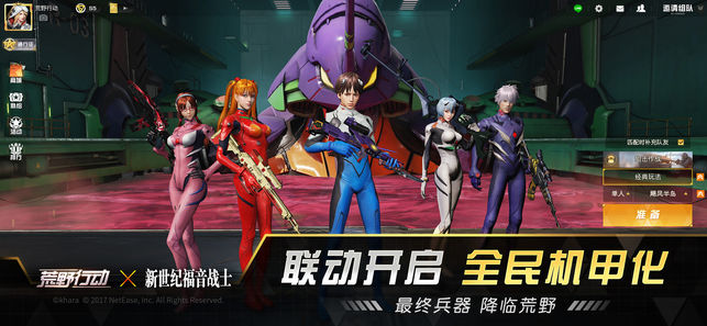 【全民机甲化!最终兵器降临荒野!】 穿上机甲战衣,手持阳电子炮,碇真嗣、明日香、绫波零、初号机、零号机...角色与机甲造型时装登场! 【五人适格者集结,准备作战!】 操控最终兵器,向使徒所在地集结!我们是荒野最后的一道防线!瞄准锁定目标,使徒迎击作战开始! 【不要逃避!击败使徒,守卫荒野!】 战局瞬息万变,面对使徒的可怕激光我们绝不逃避!因为我身边有着一起守卫荒野的同伴! 【分秒必争,全速奔赴前线战场!】 初号机、零号机、二号机造型载具登场!坐上它们,给你驾驭机甲的爽快感,以最快的速度奔赴战场! 【百人竞技,制胜荒野】 胜者唯一,紧张刺激!全面戒备,时刻警惕,每一秒都可能成为制胜的关键…