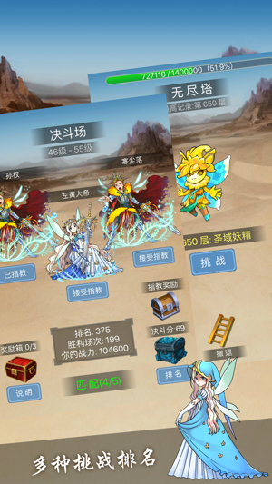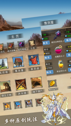 不一样的放置类游戏... 更简单明了的属性装备系统,特别的神魂及光辉系统,可在每次获得新的精灵和角色的同时,拥有新的属性加成选择. 单个角色或精灵最多装备四条神魂,可自由地搭配属性. 装备最多同时拥有9条属性,3条主属性+6条附加属性. 可以通过捕捉和道具召唤的方式获得精灵. 游戏中拥有多种途径获得钻石,任务、冒险以及挑战...
