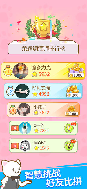 你是物理学霸,擅长重力解谜? 或者是顶级调酒师,有无尽的创造天赋? 无论你是哪一种。 都能在这里找到你的归宿。 猫千杯 是一款任何年龄段人群都会沉溺其中的解谜益智游戏。 轻松上手,物理模拟,无限挑战,充满无尽乐趣。 ***风格*** 画风简洁明了。 既有炫酷的鸡尾酒酒杯。 又有可爱的萌猫元素。 音乐轻松俏皮。 ***玩法*** 划线解谜,关卡破解。 你需要划一条线,让酒瓶中的酒流入酒杯。 然后合成一杯风味绝佳的鸡尾酒。 划线要精准,不然水流会很快流失。 ***难度*** 谁说物理游戏单调无趣? 高度逼真的物理模拟,使水流更加流畅,操…