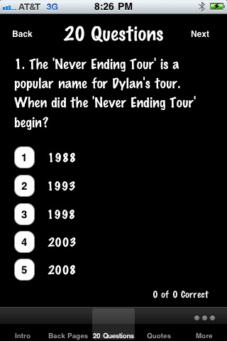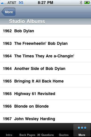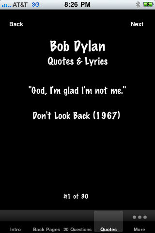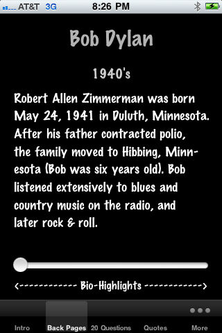 A TRIBUTE TO BOB DYLAN! A must for all Dylan fans! God, I'm glad I'm not me -Bob Dylan Here's what's in the app: 1) Back Pages. Biographical highlights from Bob's life from the early days in Minnesota to the 2010's. 2) 20 Questions. Twenty fascinating questions about topics like his background and music. If you know the answers to all these questions, you're definitely a huge fan! If not, then maybe you will find some interesting insight about Dylan. 3) Quotes. 30 great Bob Dylan quotes/lyrics. 4) Albums. A discography of studio albums, live albums, compilations, The Bootleg Series, and Bootlegs. 5) Awards. A list of some awards and honors Bob Dylan has received. 6) Word Tangle. An anagram game with 45 word puzzles using words from ''Tangled Up In Blue. 7) Subterranean Hangman. Just for fun, see if you can solve all 68 of these puzzles based on ''Subterranean Homesick Blues''. This app is loaded with info about Bob Dylan! Notice: The 'Dylan' app and Triple Iron Ventures are not affiliated with, sponsored, or endorsed by Bob Dylan, or his affiliates in any way. Triple Iron Ventures has attempted to confirm the reliability of information contained in this app, but does not make any representations or warranties thereof, including without limitation the completeness or accuracy of such information. This app is intended for educational and informational use only.