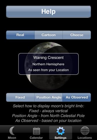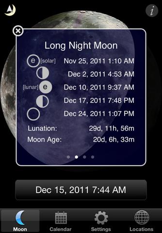 MoonPhase for both iPhone and iPad is your guide to all sorts of moon info! And a little bit of sun info too. All presented in a beautiful, easy to use format. So convenient you will use it everyday! Easily find for today or any day between 1900-2100: - moon rise/set times - moon transit times - lunar cycle details with eclipse indicators - full moon names (including Blue Moons) - zodiac position - moon's location in the sky - moon phase (of course!) - observed moon angle (optional) - sun rise/set times - sun transit times Use it to find times for moonlit walks, avoiding werewolves and maybe even fishing! Whatever your lunar info needs, MoonPhase has you covered. No internet connection is required so it works wherever you are. Other features: - Swipe up/down to change the date - Display autosets for Northern or Southern Hemispheres - Show moon as real, cartoon, or cheese! - Select dates between 1900 and 2100 - Use built in location capability or select from map - Fast Forward to next New or Full Moon - Audible Werewolf Warning (also available as free ringtone!) - Ephemeris details such as JDE, distance, right ascension, declination, azimuth, altitude and fraction illuminated - Easily change between your favorite locations ****** Like MoonPhase's Howl? Get your Howl iPhone ringtone at our website: http://www.romanduck.com/howl ******