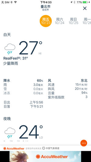 我们是最值得信赖的天气预报品牌,根据我们发布的当地天气预报规划一天的行程安排!iPhone 版 AccuWeather 能快捷方便地为您提供最新天气信息,扫除您的后顾之忧,从穿衣到出行,让您从容做出各项安排。 免费下载 iPhone 版 AccuWeather,开始体验最精准的本地天气预报!
