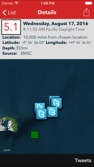 *****刊登在《纽约时报》上&入选《计算机世界》"最受喜爱的智能手机应用程序" ***** 最全面的地震应用程序!最多全球报告机构。最快载入时段! 实时跟踪和关注全球地震和海啸! 主要功能: *实时报告全球震级超过1.0的地震 * 本地、实时通知!(接收离某位置的自定义距离震级超过2.5的地震提醒。) * 根据震级自定义提醒和"静音时间" (根据设定时间封锁通知) * 海啸信息 * 国际报告机构 (美国地质调查局、欧洲地中海地震中心,地理网、加拿大自然资源部、英国地质调查局,澳大利亚地球科学组织、国家地理学暨火山学研究所、火山和地震观测台、德国地学研究中心) * 通过距离…