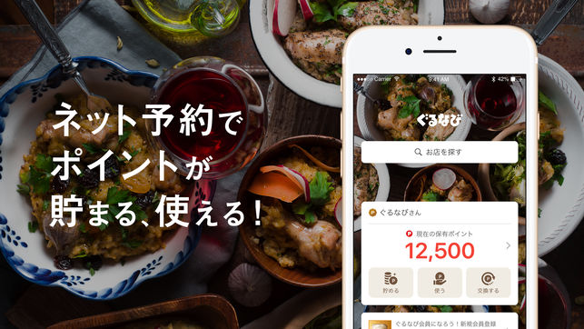 ■ぐるなびアプリの主な機能 1) ぐるなび会員情報・保有ポイントの確認 2)飲食店の検索 ・今すぐ飲めるお店を探す「イマノモ!」 ・エリアから探す ・駅から探す ・現在地周辺から探す ・特集から探す ・ランチのあるお店を探す ・ネット予約できるお店を探す 3)お店の詳細情報 設備やサービスなどの詳しい情報やお店がこだわっているポイント、画像などからお気に入りのお店を見つけることができます。 左右のスワイプでのページ切り替えや、画像の拡大などにも対応しより見やすく生まれ変わっています。 4)お店のこだわり 「直送天然地魚」「ゆったり寛げるダイニング席」など、食材や雰囲気などのお店のウリ情報…