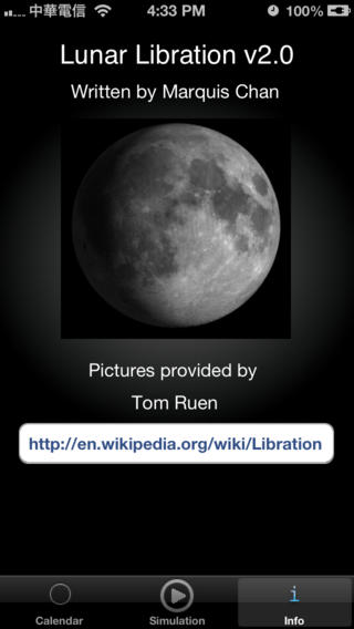 MoonLib is your guide to the current moon status. You can have beautiful pictures of the moon. With the new version of Moon Lunation, we bring you the Phase calendar of the whole month !! Million thanks to Tom Ruen again!! Please write review if you feel this program is good !!!!! Million thanks to Tom Ruen's guding in writing the program. (http://en.wikipedia.org/wiki/User:Tomruen) The full libration of moon with phase photo will also be included. Just buy it and enjoy the beauty of the moon. No internet connection is required and you can look at it at any time you want. Requirements: Compatible with iPhone and iPod Touch iPhone 2.0 Software Update