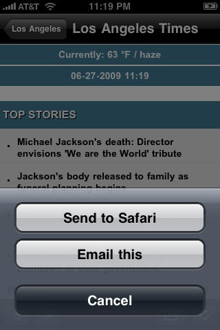 Los Angeles Local News provides quick access to all the top news sites for the great city of Los Angeles, including many that are specially formatted for the iPhone or iPod Touch screen. A great way to enhance your reading experience. We put a lot of thought into the best collection of sites to include for Los Angeles. It's also easy to share an article via email when you find something your friends and family might be interested in. Current sites included - Los Angeles Times (LA Times) - Orange County Register - CBS Los Angeles - KCBS - NBC Los Angeles - KNBC - ABC Los Angeles - KABC - FOX Los Angeles - KTTV - The Hollywood Reporter - Outside.In listings for Los Angeles - Los Angeles Weather