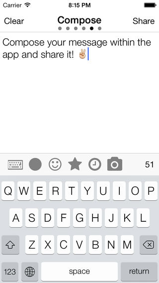 Touch & Copy Character improves your texting, chatting, twittering and blogging making it more fun! It displays an awesome list of fun characters for you to use. How does it work? Just touch and go! When you touch a character it is automatically gets copied, for you to use in any other application, using paste. Over 60000+ icons, including Emoji Tap once to copy the icon to the clipboard and paste it in any app! Tap and hold to order your icons wherever you want! Requirements: Runs on all your iOS 7 devices Known issues: When pasting the characters they seem rather small. This is not something that the application can change, it's rather the size that Apple gives to them across all applications. Emoji characters are bigger, but with this application you can use the characters in all apps, mails, and SMS without limitations. You can contact me on any questions, doubts, suggestions or bug-reports: support@sebastianarena.net or visit me at www.sebastianarena.net