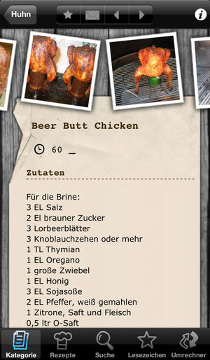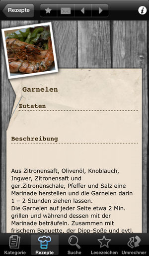 Über 5300 Grillrezepte!!! Die Rezepte-App der größten deutschsprachigen Seite im Internet zum Thema Grillen! Mai 2011: In den Top Ten aller Apps des deutschen Appstores - Die Ladezeit für ein Datenbankupdate wurde um zwei Drittel verkürzt - Neue Datenbankupdate-Optionen - Bilder der Rezepte könn…