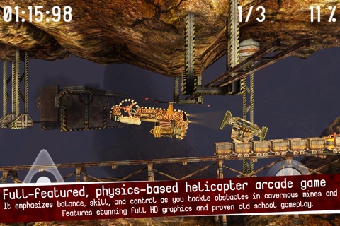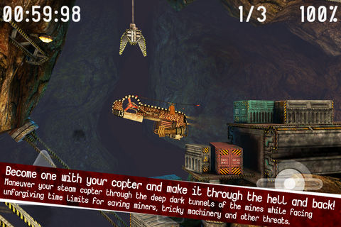 REVIEWS: AppCraver: 10/10 “It’s fun. It’s difficult. It’s addictive. ... That’s why Gyro13 – Steam Copter Arcade HD is a must buy.” 148Apps: 4.5/5 “It’s more involved than a typical corridor flyer, looks great, plays well and is absolutely loaded with challenge.” touchArcade: 4.5/5 “This game is sexy... Textures, lighting and shadows are all top notch.” iReviewT: “A”+Must Have Award “Stunning graphics, proven game concept, precise control scheme.” TheAppShack: 10/10 “One of the best iOS games I have ever had the pleasure of playing.” Arcadelife: 87% “Gorgeous looking, difficult, often quite frustrating, but overall fun game.” SlideToPlay: 3/4 “This is a great looking game with a significant challenge level and fun retro gameplay.” • Universal App - Play Gyro13 on iPhone 3GS, iPhone 4, iPad, iPad 2, iPod Touch 3 (16 GB and above), or iPod Touch 4 for a single low price. • It is one of the first iOS games powered by the stunning Unreal® Engine – Unreal Development Kit by Epic Games. • Optimized for iPhone 4 and iPad 2 – Includes high-resolution graphics that utilize the enhanced visual capabilities of the iPhone 4 and iPad 2. • You Tube: http://www.youtube.com/watch?v=fzdGPqM9Qug Ready to Fly Deep? Gyro13 is a full-featured, physics-based helicopter arcade game with dozens of levels. It emphasizes balance, skill, and control as you tackle obstacles in cavernous mines. Maneuver your steam copter through the deep dark tunnels of the mines while facing unforgiving time limits for saving miners, tricky machinery and other threats. The game features stunning full HD graphics and proven old school gameplay. If you think you can: • avoid or use the treacherous wind rifts to your advantage • save all miners • find ways to operate puzzling machines • escape even from the most desperate situations • deal with the lethal poisonous clouds • master the powerful pulse cannon • become one with your copter and make it through the hell and back then download now… Follow us on Twitter: http://gyro13.com/twitter Become a fan of Gyro13 on Facebook: http://gyro13.com/facebook For more information or support, please visit http://gyro13.com or http://games.cinemax.cz