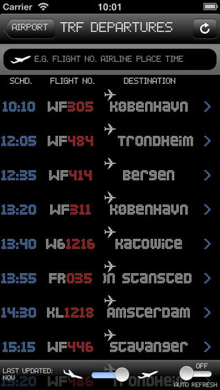 Real-time Norwegian Airports flight arrival and departure information. Flight arrival and departure time, flight status and destination are synchronized with your iPhone, iPod touch and iPad. Covers all airports in Norway. Features: Convenience - Program auto-detects and searches the most current flight for you. Power - Advanced search tools for flight, status and destination information. Simply enter ANY keywords to filter out your flight. Universal - natively support both iPad and iPhone All flight information at your fingertips!