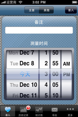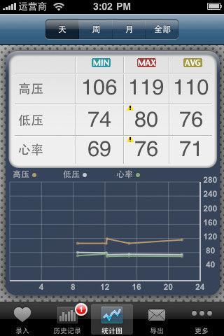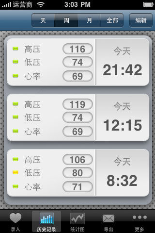 ******在18个国家的App Store排入医疗类百强软件!请放心购买!****** 这是一款简单易用的血压记录程序!App Store上唯一一款简体中文的血压记录程序,感谢您支持正版软件,购买正版软件! 血压记录帮您记录血压,跟踪血压读数,还可以查看血压的图表。您可以使用这款软件来协助医生为您诊断。 ****** 用法简单,只需要正常测量您的血压和脉搏,几秒之内就可以录入进软件中。血压记录软件帮你记录高低压和脉搏。 对于老年人,我们在输入的界面提供了一个放大镜,可以让他们更容易看清楚输入的数字。 主要特点: ♥ 简体中文界面! ♥ 用手指划动即可简单输入数据,无须使用键盘输入。 ♥ 我们在界面上提供了一个放大镜!(请看截图) ♥ 漂亮易用的用户界面,输入就像一个真正的血压表。另外,还有指示灯,表示您输入的血压是否正常。 ♥ 绿灯表示您输入的数据正常,黄灯表示警告,红灯表示非正常。 ♥ 一天内可以录入多笔数据。 ♥ 您可以定制血压记录的笔记,可以修改时间。 ♥ 漂亮的可视图表,让您更容易地查阅血压趋势。如果您血压异常,也会有不同颜色的提示。 ♥ 可以很容易地导出到CSV格式,并发给您的医生。 *本程序只能帮您记录数据,并不能用于诊断、治疗、治愈或预防任何疾病。对于医疗建议,一定要咨询您的医生。