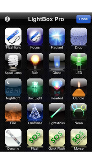 一个专业的月光宝盒,带有20几种不同的光源:电筒(含LED灯),小夜灯(带数字时钟)以及呼救信号灯,等等。 [月光宝盒里有什么] 含有各种各样的灯光 * 手电筒 - 经典的 - 聚焦的 - 发散的 - 水滴的 - LED灯(iPhone 4以上) * 真实的灯光 - 螺旋灯泡 - 白炽灯 - 玻璃灯 - 荧光灯 * 小夜灯(带数字时钟) - 经典的 - 立方的 - 心形灯 * 节日、有趣的灯 - 蜡烛 (含动画) - 火光 (含动画、音效) - 圣诞 (含动画、音效) - 光棒 (含音效) - 霓虹灯 (含音效) - 有趣的“手摇发电”灯 * 呼救信号(SOS)灯 - 闪烁(带音效) - 快速闪烁(带音效) - 莫尔斯码(morse) (带音效)