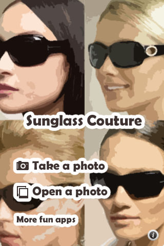 Do you hate trying on pair after pair of sunglasses just to see which ones will look the best on you?? Or are you looking to buy sunglasses as a gift for someone? Its impossible to know which pair will look the best. With Sunglass Couture, you can take a picture, or select a photo in your library and virtually try on 50 of the most popular sunglasses for sale today... Choose a pair, position it on a photo, size it rotate it, and then save it to share with your friends on Myspace or Facebook! Automatically post it to Twitter to get the opinion of your friends.