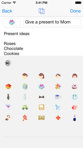 version 1.2: 修正了中文的翻译 修正了问题 ************************************** 愉快的待办事项管理体验,在 代办-进行中-完成 三种状态中灵活切换! ************************************** 您是否曾经经历过: 您有太多的工作要安排? 您想按优先级区分工作? 您担心忘记之前制定的时间表? 您不愿意忘记朋友的生日? 您想要为纪念日准备一份很棒的礼物? 您想要提醒您的孩子参加运动会或学校访问日? 这款应用程序帮助您方便地记住并完成您的待办事项。 它不只是一款实用的待办事项管理工具,同时也是您的个人信息管理工具。 您可以设置每个注册事件的截止时间。状态栏会显示待办事项的剩余时间,天数和月数。 你也可以按代办事项,进行中事项,以及已完成事项来分类整理所有事项,并可以一次点击来切换视图。简单并且快捷。 您可以设置至多 4 种优先级别,让您能轻松了解您当前最重要的待办事项。 添加分类图标来显示待办事项的类型。 您可以按日期,优先级或图标来分类待办事项。 功能 简洁的用户界面和简单的事项录入 设置截止日期 设置优先级 状态栏直观显示余下的剩余天数 按截止日期,优先级或分类图标分类 通过添加图标来管理待办事项 通过日期和时间来管理 如何操作 屏幕下方状态栏切换“代办”,“进行中”和“完成” 中上方图标用于按优先级,截止日期和图标来分类事项 右上方按钮用于录入新的待办事项 左上方按钮用于更改设置 点按已录入的待办事项来切换至编辑页面