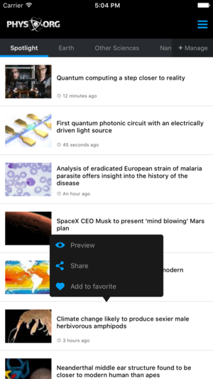 Daily spotlight science and technology news stories from Phys.org. This includes stories in the fields of physics, nanotechnology, electronics, space and earth sciences, biology, chemistry, computer sciences, engineering, mathematics, etc. Readers may rate, bookmark and share favorite stories from…