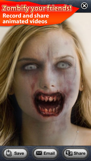 详细 : 在日本的App Store娱乐类别里获得第一名! 在意大利的App Store获得综合第一名! 在突尼斯的App Store获得综合第一名! “ZombieBooth”只需要一张脸部照片,就可以将其变成超级真实的3D动态僵尸。本软件为您准备了几十种可变的僵尸模式,在僵尸们狰狞的嚎叫声中将观看者带入僵尸游荡的恐怖世界。 点击屏幕或拖动画面,随着位置的变化,发动你的想象力,你可以指挥僵尸做出各种各样的动作。比方说,用手指点僵尸嘴巴周围,可以使僵尸吃手指。请您在极度恐惧中流连于不可思议的僵尸国度。 变成僵尸的动画可以保存起来,直接上传至Facebook或Youtube,也可以通过邮件…
