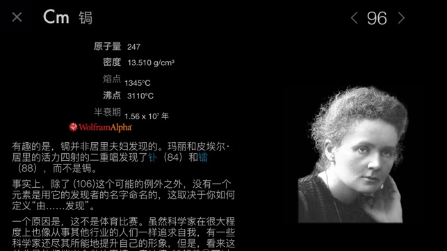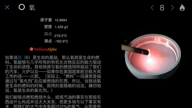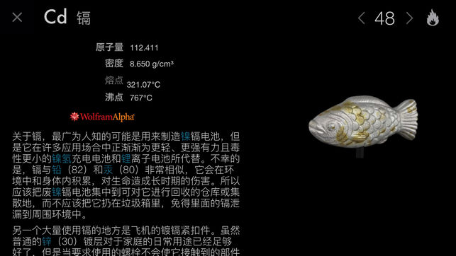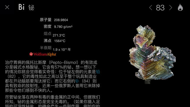 在所有元素周期表应用程序中,只有一个被Stephen Fry描述为“仅此一个就让iPad物超所值!”。“视觉之旅—神奇的化学元素”并不是一个参考资料应用程序,而是用文字和图片讲述了一个丰富迷人的元素周期表故事,让您以前所未见的方式,去体验我们宇宙构建模块的美丽与神奇。 “神奇的化学元素”基于国际畅销书《神奇的化学元素》精装版改编,作者为《大众科学》杂志“灰质”专栏作家Theodore Gray。但它远远超越了书本所能为您带来的观感。 首先您会看到一个栩栩如生的元素周期表,每个元素都以流畅旋转的示例显示。要了解锡元素,可以点击小锡兵。要了解金元素,可以点击金块。你会立即看到示例几乎铺满整个屏…