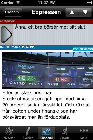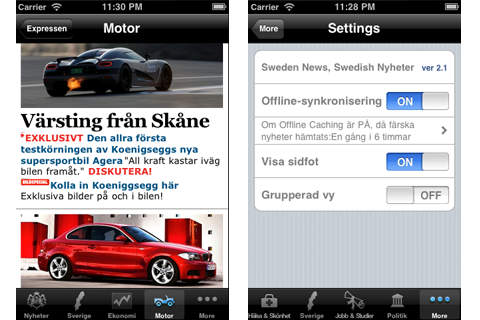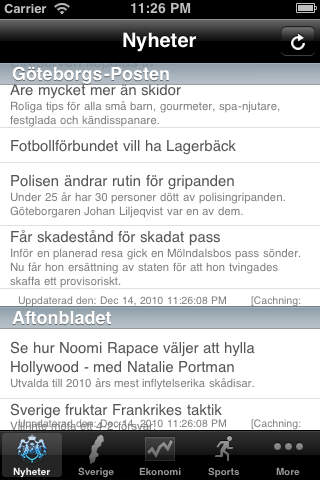 Sweden 24/7, Swedish Nyheter is a very simple e-news reader for the people of Sweden. This app brings you the latest news from all the top Sweden news sources. > Offline Caching of News (Works with out internet connection) > Emailing of news articles > Customized news table view > iOS 4.0 & iPad Compatibility > Supports both RSS & Atom feeds > Portrait & Landscape orientation