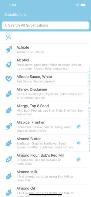 Substitutions. Food & Drink. iOS 11 or later. Now nearly 1500 substitutions. Search! Alcohol. Allergy. Baking. Cooking. Dairy. Gluten-Free. Herbs. Spices. Low Carb. Low Fat. Low Sodium. Migraine. Seafood. Meat. Utensil. Vegan. Twitter: @Gormaya