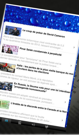 Comme beaucoup de personnes, vous aimez être tenu informé des derniers événements qui ont lieu en France et dans le monde. Et comme la majorité des personnes, il vous est difficile de regarder les actualités au bon moment, et acheter tous les quotidiens n'est vraiment pas rentable. De plus, lire le contenu de tous ces journaux vous prend bien trop de temps. Le Monde,Le Figaro,Liberation,Nouvelobs, 20 Minutes,Le Parisien,Le Progres,Ouest-France France Soir,Courrier International. Il existe une meilleure solution ! L'application vous met en contact avec les journaux français . est une application qui fonctionne sur votre iPhone, sur votre ipod Touch, et sur votre iPad. est une application récemment mise à jour, qui contient de nouvelles fonctions de qualité pour accéder aux actualités et partager en temps réel vos articles de journaux préférés. Que sont les Journaux Français ? Une application innovante qui simplifie l'accès aux dernières actualités et aux titres à la une – des journaux, à la radio, et en vidéo. 1 Une revue rapide de l'actualité et des flux pour des résumés 2 Cliquez sur un titre pour accéder à l'article en entier et en savoir plus 3 À partir de n'importe quel article, d'un simple clic vous accédez au site internet des journaux 4 Partagez vos articles favoris via e-mail, Facebook et Twitter est facile à utiliser,est très économique, est la meilleure façon de rester au top de l'information à tout moment de la journée où que vous soyez. Téléchargez cette application aujourd'hui! Les caractéristiques de l'application des Journaux Français Avec cette application, vous êtes relié au monde en permanence – Vous et serez toujours informé des derniers événements, de ce qui se passe sur , de ce dont on parle sur même si vous et n'avez pas eu l'opportunité de regarder les informations de la journée. −Une interface facile à utiliser qui écume rapidement les titres de la une et affiche les résumés de l'actualité. −Tous les flux des principaux journaux sont accessibles sur une seule page – pas de recherche prolongée. −Ajoutez votre journal préféré pour personnaliser votre flux. −Les mises en jour permanentes vous tiennent informé de ce qui se passe sur à chaque instant. −Gardez les actualités radio pour les écouter quand vous et êtes prêts : dans le bus, à la gym, à la maison, etc... −Regardez les dernières actualités en vidéo où que vous soyez, quand vous le voulez. −Restez au top des discussions de - sur les réseaux sociaux – rappelez-vous, les informations circulent plus vite sur les réseaux sociaux que sur les autres modes de communication ! Choisissez la manière la plus rapide, la plus facile et la plus économique de rester au top de l'information capitale et des événements percutants en téléchargeant cette application maintenant. À chaque minute, l'information se crée, que vous et &rsquo ; soyez présents ou non. Ne restez pas à la traîne derrière les autres et obtenez les dernières nouvelles de l'actualité en un simple clic ! Les derniers articles des Journaux Français -est vraiment une application de qualité. Les textes sont édités dans un format facile à lire, aucun problème n'a été détecté. Cette application fonctionne avec des fichiers audio, des fichiers vidéo et bien plus encore. Je recommande vivement cette application - Cast - Une application parfaite - Tibispeed - J'adore cette application, elle me donne toutes les infos que je veux. - Gilgizid - J'utilise cette application depuis un an maintenant. De loin, la meilleure application existante. Je lui donne un A+++. - Awitc - La principale raison pour laquelle j'adore cette application est parce qu'elle est d'ici et qu'elle permet d'avoir les infos locales. - Marc -Exactement ce que je voulais. - J'adore avoir les dernières actualités mondiales et de à portée de main. Super format.- Gardengirl123