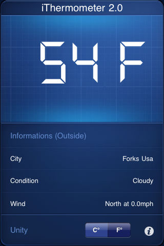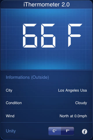 iThermometer is an application pretty, simple, accurate, and efficient. Unlike standard applications (with predefined cities), this version thermometer will give you the exact temperature of the place where you are. The application also provides weather reports of a large detail. Functional for more than 2 million cities worldwide. Forecasts are available 24/7 and updated on average every three hours. It integrates its own conversion degrees celsius in degrees fahrenheit. A handy application to a minimum price, why not try it ? Exclusive: Available in english, french, german, spanish, Italian, portuguese and dutch. (To access all the functionalities of the station your iPhone must be connected to the internet (Edge, 3G or WiFi)).