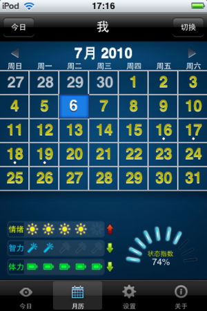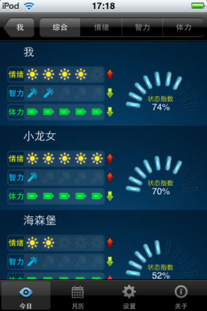 *被sohu科技 列为iphone4的10大免费软件第一位 - 2010年7月30日 *被爱apps评为每日推荐软件 - 2010年7月23日 *苹果软件商店TOP FREE 排行榜连续1周排名第一软件 - 2010年 7.23 - 7.30 *苹果软件商店免费软件健康类下载量连续4周 排名第一 2010年7.23 - 8.20 ---------------------------------------------- 【有关生理节律】 在日常生活中,几乎每个人都有这么一种感觉:有时体力充沛,情绪饱满,精神焕发;而另一些时候却又感到浑身疲乏,情绪低落,精神萎靡。…