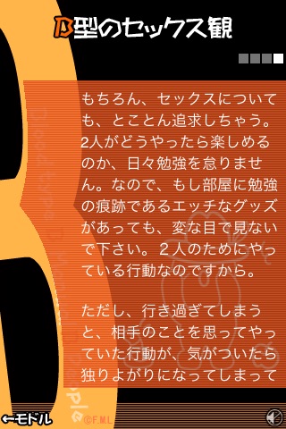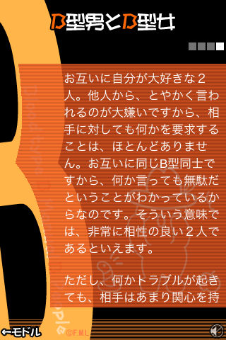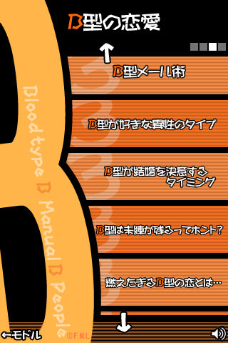 ★★★★★★★★★★★★★★★★★★★★ ライフスタイルカテゴリ ベスト4独占!! 総合トップ50に全血液型同時ランクイン! (8/14-8/18) AppStoreおすすめ[NEW]に掲載!(8/13-8/27) ☆☆累計2万5千ダウンロード突破!!☆☆ セール期間を延長のまま(230円が115円!) 鑑定結果ボリュームUP!ぜひこの機会に! ★★★★★★★★★★★★★★★★★★★★ 自由奔放で超マイペース。だけど実はナイーブ?そんなB型人間の本性が分かっちゃう!? 基本的な行動と考え方から恋愛まで項目別に細かく分析されているので自分でも気づかない意外な一面がわかるかも。 また、各血液型との相性やエッチの傾向まで気になるB型さんホンネを知りたいアナタにも必須マニュアルです! ●基本的な行動と考え方 B型のかいせつ 変わり者になりたい願望? 天邪鬼なB型の言動 B型特有の人との接し方 B型が物事を決めるとき B型のショッピング徹底解明 B型の話術 自分からみた自分 B型が好きになるもの B型の集中力 ●B型の恋愛 恋愛相談とかするの? B型メール術 B型が好きな異性のタイプ B型が結婚を決意するタイミング B型は未練が残るってホント? 燃えたぎるB型の恋とは・・・ B型のセックス観 ●B型を知る 浮気?それとも本気 B型、本当のトコロ B型のキレ方 B型の行動パターン 細かく言われるのが大嫌い。B型の本質 ●B型との相性 B型男とA型女 B型男とB型女 B型男とO型女 B型男とAB型女 B型女とA型男 B型女とB型男 B型女とO型男 B型女とAB型男 ●B型の落とし方 B型女のシンデレラ願望 自分では駆け引き上手のつもりのB型男 軽くて淡白。でもアブノーマルなB型 B型は、本当は振り回されたい!? 誉めどころを掴んだら、B型は落ちる! ★鑑定士プロフィール F.M.L※female media laboratory 占い/心理・美容・健康コンテンツを中心とした女性向けのコンテンツを多数手がける集団。 多数のクリエーターが所属している為提供しているコンテンツは多岐にわたる。 【実績】 通信キャリア公式占いサイト監修 通信キャリア公式女性の医学サイト監修(一部のみ) 通信キャリア公式お悩み相談サイト監修(一部のみ) その他診断,心理テスト,コラム,Q&A製作等多数 その他多数