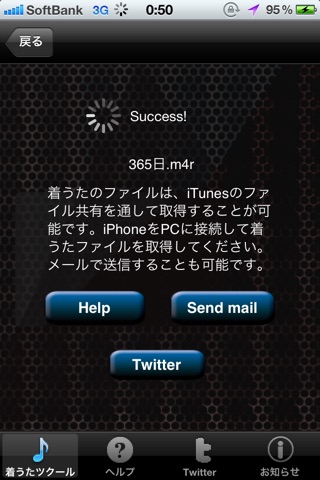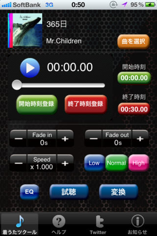 ★雑誌掲載実績★ ・『CUTiE』(キューティ)2011年3月号にもご紹介頂きました!女性にも優しいアプリ ・落としたい!! 使えるiPhone4アプリ厳選集(1/28) ・宝島社のAKBが表紙のsmartにて紹介されました!(11/24) ※smartは男性ファッション誌国内NO.1のオシャレな雑誌です。(あのメンズノンノよりも売れています!) おかげさまで日本での有料ランキング2位、ミュージックカテゴリ1位!(2010年実績) 海外でもご評価頂いております! ■ミュージックカテゴリ1位 フランス・イタリア・ルクセンブルグなど5カ国 その他10位以内には20カ国ランクイン♪ 多彩な機能搭載です! ■ver.3 新機能 ・イコライザー機能追加!(DanceやRockなど曲調の変更) ・着うたファイルの同期方法を追加(メール or PC接続) ・twitterで着うたの曲と時間をつぶやけます ■ver.2の追加機能 ・フェードイン、フェードアウトの追加 ・再生スピードの変更 ■お楽しみトリビア 速度調整をすることにより、平井堅さん⇄一青窈さん お互いの歌声がかなり近くなります。 どうぞお試しください♪ -speed設定 0.825〜0.800 一青窈さんの曲が平井堅さんの歌声に! 1.175〜1.200 平井堅さんの曲が一青窈さんの歌声に! --- --- --- --- --- --- --- --- --- --- --- --- iPhoneに足りない機能はなんだろう? この魔法のアイテムに唯一足りなかったもの それが自分のお気に入りの曲の「着うた(着メロ)」作成・設定です!! itunesを使って色々な設定を変更したり試行錯誤すると作成できるのですが、それよりももっと簡単にiPhoneの中に入っている曲を利用して「着うた(着メロ)」を作成するアプリが完成しました!!! ■仕組みはいたって簡単(着うた作成方法) ①iPhoneに登録されている曲の中から着うたにしたい曲を選択! ②着信音にしたい部分を調整(40秒以内) ③ワンクリックで着信音用に変換し、あなたのPCへメールで送信します。 ④届いたメールの添付ファイルを「iTunes」にドラック&ドロップすると「着信音」といフォルダが新規作成されます。 ⑤iPhoneを同期する(着信音の同期) ⑥iPhoneの「設定」→「サウンド」→「着信音」で「カスタム」の中に曲が登録されますのでこれで完成です!! 難しい設定などが苦手な女性の方でも簡単に「着うた(着メロ)」が作れちゃいます! 着信音が変われば気分も変わる! お気に入りの一曲で早速「着うた」を作成しよう~♪ --------【注意事項】-------- メール着信音に設定する場合は、20秒以内で作成してください。 iPhone 3GS以上限定となりますのでご注意ください。(特にiPhone3G端末の方はご利用頂けませんのでお気をつけください。) ※対応ファイル形式:AAC(保護なし)、MP3、WAV iTunesよりダウンロードされた曲は、だいたい保護されているため着うたに変換出来ないケースが多いです。 ※SMS/MMSでの着うたはiOS5にバージョンアップしてください。 ※アプリに関するお問い合わせフォームはこちら http://bit.ly/ifUE7v