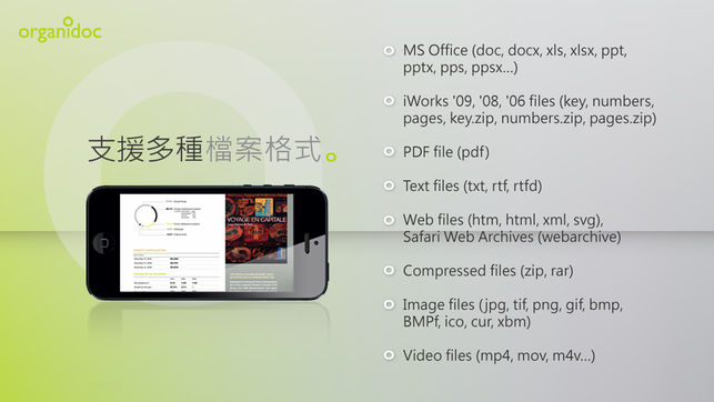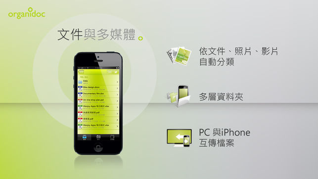 * 2010年九月上市,即获得App Store之New & Noteworthy殊荣。 * 大中华区进入"What's Hot"推荐。 * 2010年十月台湾区攻上Productivity类第一名。 * 2010年十一月登上台湾区不分类Top Paid 和Top Grossing第一名。 如果你有以下的疑问,OrganiDoc将是你最佳的app方案。 1.当你临时想看邮件中的重要附件时,只能重新下载邮件才找得到吗? 2.你发现iPhone中空间剩一大堆,却不知道放什么有用的东西吗? 3.你想用免费的云端硬盘帮你备份及分享文件,又可以在iPhone上随时浏览吗? 4.你有很多私人的文件、图片…