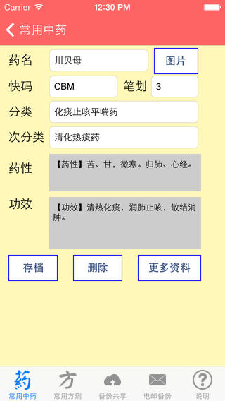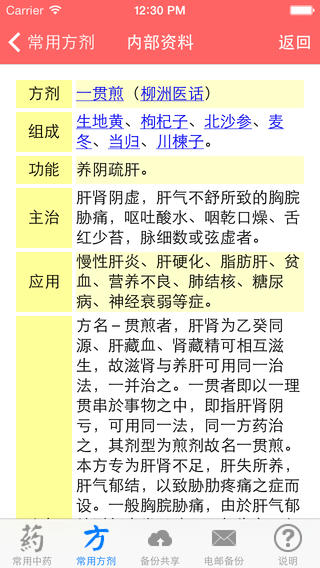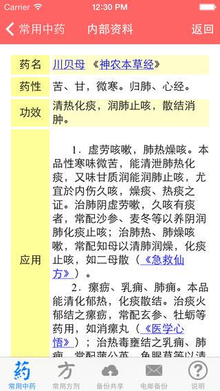 中药及方剂速查 *可以修改的电子书* (簡体中文版) 内部收录常用中药资料470多条,常用方剂270多条。可自由加入,删除,修改及快速地查找中药及方剂资料,让你建立个人化的资料表。没有网络连接也能使用。如内部没有资料,更会自动连网查找。 ***** 注意:中药及方剂速查【研习版】2016 经已推出***** https://itunes.apple.com/hk/app/zhong-yao-ji-fang-ji-su-cha/id1116858729 ***** 注意:中医诊所系统 2016 经已推出***** https://itunes.apple.com/hk/app/zhong-yi-zhen-suo-xi-tong/id1104742864 ***** 注意:中药及方剂速查【加强版】經已推出 ***** http://itunes.apple.com/cn/app/zhong-yao-ji-fang-ji-su-cha/id521511036 ****** 注意:中医处方系统【加强版】經已推出 ****** http://itunes.apple.com/cn/app/zhong-yi-chu-fang-xi-tong/id504789839 *************************************************** 特点 ---------------- - 不用上网也能查找所有内部资料 - 不用输入中文也能查找中药及方剂 - 特有拼音快码查找。例如查“人参”,只需打 “RC” - 查“香砂六君子汤”,只需打 “XSLJZT” - 快码可随意更改。 - 可以用笔划查找。打入“10”便可查阅10划的中药或方剂 - 也可以按名称,分类,功效,主治,功能等等来查找 - 方剂内所有成份中药也可以作个别查阅,不用再次查找 - 可随意加入,更改,删除内部中药及方剂资料。 - 内部有超多连接,不用打字也可自动连接网络查阅更多资料及图片 - 可同时安装于 iPhone,iPod 及 iPad - 可以上载及下载中药及方剂资料到谷歌文件Google docs。(內地要vpn连线才可使用) - 可以在 PC 上登入Google docs 修改资料,然后下载至 iPhone, iPod 及 iPad。方便统一 iPhone, iPod 及 iPad上的资料库。(內地要vpn连线才可使用) - 可以和朋友交流共享中药及方剂资料。 - 多项资料查找功能,例如查含有人参,白术及甘草的方剂,只需用空格分隔打入“人参 白术 甘草” - 加入邮件备份功能,解决国内用户不能使用Google Docs备份的问题。用户可以经由邮件备份,分享,修改及还原备份。 - 加入“内部”查找项,用户可查找所有应用、使用注意、古籍等等内部资料,例如可以查找 “高血压”、“胃寒”、“五十肩”,等等相关的中药或方剂资料。 免责条款 本软件所有资料只供参考之用。 任何一切因使用本软件而引致之任何损失,包括疏忽、意外、合约毁坏、诽谤、版权或知识产权侵犯及其所造成的损失,作者概不负责,亦不需承担任何法律责任。 任何透过本软件而连接及得到之资讯、产品及服务,作者概不负责 ,亦不负上任何法律责任 。