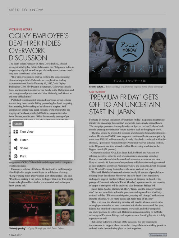 Campaign Asia-Pacific is an industry brand dedicated to the business of communication in Asia Pacific. Campaign Asia-Pacific’s vision is to be a seamless and essential news, insight and research network for advertising, marketing, media and PR professionals across the region. Campaign Asia-Pacific magazine delivers deep and broad analysis of industry trends, insights, developments and issues, making it a must-read for the decision makers driving agencies, brands and suppliers. Campaign Asia-Pacific magazine publishes 10 times a year. •Magazine app is free to download on iPhone, iPad and iPod Touch. •Subscribers with digital access can enjoy access to full content in the magazine. •This version of the app is compatible with devices that have iOS 6.0 and greater. Features •Download the monthly magazine and enjoy offline reading on the move. • Switch back and forth between the full replica version and SmartFlow, which allows you to view content sized for your screen. •Translate articles or have them read to you in English using our text-to-speech feature. •Share articles via FaceBook, Twitter, and Email. •Download or access back issues of the magazine. Subscriptions •Subscribe one year (10 issues) for US$74.99 or 1 issue for US$14.99. If available, you will be charged in your local currency at prevailing exchange rate as defined by iTunes. •In-app purchases will be processed through your iTunes account. •Subscriptions automatically renew unless auto-renew is turned off at least 24-hours before the end of the current period. •Account will be charged for renewal within 24-hours prior to the end of the current period at the price of the original subscription. •To manage your account and auto-renewals (including turning off auto-renewals), please visit your iTunes Account Settings. •Unfortunately we are unable to cancel your paid subscription while it is active. Support Should you require any assistance using our app please visit www.campaignasia.com/Page/MobileApps.aspx for answers to frequently asked questions or contact our customer service at cs@haymarket.asia.