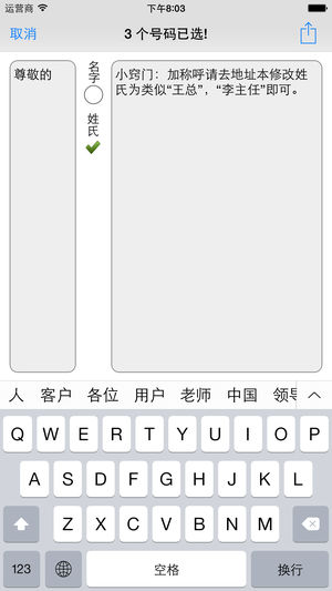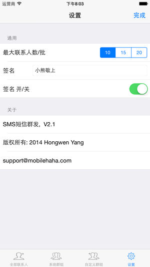 "任意群组(系统,定制或临时成组)+ 普通和个性化短信模式 + 大群组的批处理 + 签名 + 强大的搜索能力+最新UI技术全屏适应所有iPhone/iPod/iPad" 支持普通和个性化两种群发模式,个性化模式下可自动添加接收方姓名(称谓/职务用法请参见后面的使用小窍门),比普通模式更加亲切和有诚意! 全面支持定制群组、系统群组、多联系人选择的灵活群组,个性签名以及有序的联系人列表和强大的搜索能力。真正实现简洁、灵活、高效群发短信! 特点如下: + 支持两种群发模式,普通群发和个性化群发;当姓或名被选择时,自动激活个性化短信群发,如果没选,则自动进入普通模式分批次群发; + 可定…