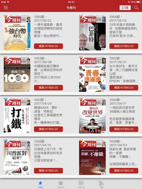 +++【今周刊 長期訂閱與單本購買】方案說明 +++ *Android帳號與iOS帳號不互通,購買內容無法共用及轉換 *建議使用iPad,依個人閱讀喜好,手機尺寸可能稍小 1) 本應用程式免費下載 ,並提供試閱雜誌,供您實際體驗。 2) 試閱後,您可以選擇單購期刊或依自己的需求,選擇訂閱期限。 自動續訂6個月,NT$ 1490。 自動續訂12個月,NT$ 2690。 *價錢可能隨活動有所變化,請依App內價格為主。 確認購買後,將從您的 Apple ID 個人帳戶扣費。 3) 本應用程式採用自動續訂 (Auto-renewal Subscriptions) 計費,系統會在到期日前24小時,自動為您續訂。如果不想續訂,請於到期日前24小時,至您的 Apple ID 個人帳戶內,關閉自動續訂功能。 4) 您可至 Apple ID 個人帳戶,查詢「訂閱到期日」。 5) 在有效的訂閱期限內,您無法取消該訂閱服務,但可選擇不再續訂。 6) 隱私條款,請見 http://www.iscreen.com/new/app/btdy/eula.html ※ 電子、紙本雜誌同步開賣零時差 ※ 掌握第一手消息,與《今周刊》零距離 ※ 下載後離線閱讀,好方便 ※ 雙點擊畫面或雙指觸控放大拖曳閱讀 ※ 自動儲存閱讀進度 *** 今周特刊【再見賈伯斯(影音版)】大獨家 *** 《今周刊》取得美國《彭博商業周刊》獨家授權,取得完整【中文版影音全記錄】。 這個紀念專輯,完整記錄了賈伯斯一生的精華,高畫質的影音內容訪談,記錄他對工作的熱情、同事們的互動、競爭者對他的看法及更多歷史鏡頭,搭配60多張豐富照片,深入介紹賈伯斯精采的一生,值得你細細品味。 本期特色: * 中文完整獨家授權美國《彭博商業周刊》 * 中文完整高畫質影音內容 * 蘋果電腦系列產品完整呈現 * 完整整理蘋果世界孕育出的新辭彙和新概念 * 真實呈現賈伯斯創立蘋果電腦與其傳奇的一生 1996年創刊的《今周刊》是台灣最專業的財經理財雜誌,為財訊文化事業集團旗下最權威、專業的財經周刊,擁有日報的速度、月刊的深度,為讀者在資訊氾濫的時代,整合最有價值的財經資訊,提供最新的投資理財方向、政經情勢變化與社會文化脈動。 《今周刊》不僅擁有謝金河、呂宗耀、黑傑克等大師的投資專欄;司徒達賢、樓永堅、吳靜吉、李仁芳等管理名師的精闢見解,更獲得美國彭博商業周刊《Bloomberg Business Week》唯一中文授權轉載每周最新精彩內容。 不以平面刊物自限。近年來積極主辦多場演講活動,邀請產、官、學界專家為讀者提供第一手觀察與見解。國際級投資大師—麥嘉華、吉姆羅傑斯、魯比尼等陸續應《今周刊》之邀來台演講,更引起熱烈迴響,幫助讀者貼近世界經濟脈動,提升了台灣的國際經濟視野。精彩且豐富的讀者活動,不僅提升了讀者視野,也為廣告贊助商與目標族群創造最佳的互動溝通平台。 《今周刊》Facebook粉絲團 http://www.businesstoday.com.tw/facebook/