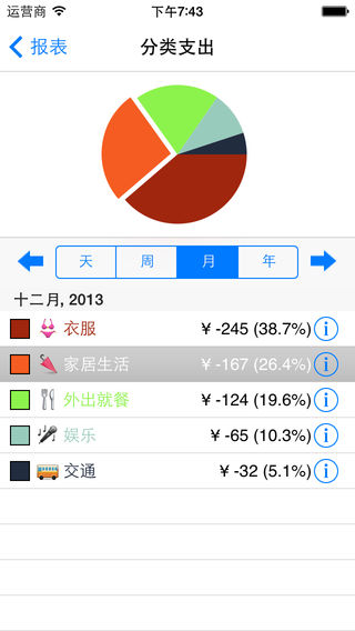 [i理财]是一个非常易于理解和使用,但又功能强大的财务管理软件。程序界面友好、直观、清爽,只需极少量的数据录入,就能实现收入、支出、账户、预算等全面的财务管理功能。 ***本软件在全球多个地区被选入财务类New & Noteworthy推荐榜*** 曾获: 台湾区总榜第二 台湾区财务类第一 香港区财务类第一 中国区财务类第二 澳大利亚区财务类第二 美国区财务类前十 加拿大区财务类前十 ...... 功能和特点: 收入和支出跟踪 * 程序可以快速,方便的添加和跟踪你的收入和支出,能自动按日,周,月,年统计收入和支出的合计值,并计算收支平衡值。 * 可以从时间/分类/账户等多种角度浏览和搜索历史记录。 * 能自动记录最近添加或修改的10条记录。 * 支持周期性收支和转账记录的自动创建。 * 支持模板功能,最快只需两次点击就能记一笔账。 多账户管理 * 可以创建多个账户并设定账户的初始余额。 * 账户之间可以自由的转账。 * 可自由调整帐户显示顺序。 * 可查看帐户的收入、支出和转账明细。 自定义分类 * 程序预置了多种常见的收支分类。 * 可以添加你自己的分类。 * 能自由的调整分类的显示顺序。 * 可以为分类添加图标,程序内置了超过460个精美的图标。 针对分类的月度预算 * 可以按收入或支出的分类制定月度预算,跟踪预算的完成进度。 * 能根据预算类型(收入/支出)和完成情况(未完成/已完成或超出),用不同的颜色显示预算执行进度。 * 能查看预算相关的收支明细。 动态可视化的报表 * 能自动生成收支对比饼图、资产组成饼图、债务分类饼图、收入分类饼图、支出分类饼图、收入变化趋势、支出变化趋势等多种可视化报表。 * 曲线图和饼图都具有动态交互能力,触摸图形能自动在表格中定位相应的记录,反之亦然。 更多 * 密码保护,数据备份让你的财务数据更安全。 * 支持导出数据到Excel * 支持iTunes,Wifi,email等多种方式的数据备份和恢复。 * 提供了每日记账提醒功能。 * 充分考虑手机操作的特点,所有按键都隔开适当的距离,防止误操作。 * 界面清爽、直观,程序稳定可靠。 如有任何意见、建议或疑问,请联系: 邮件:hcyanli@gmail.com