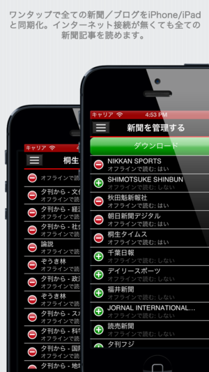日本の新聞+:日本の英語・日本語で書かれた新聞が多数。素晴らしいインターフェース。 iPhone・iPad 上のユニバーサルアプリケーション 日本の新聞: Nikkan Sports, Shimotsuke Shinbun, 秋田魁新報社, 朝日新聞デジタル, 千葉日報, デイリースポーツ, 福井新聞, Jornal International Press Japan, 読売新聞, 夕刊フジ, Japan Herald, 岩手日日新聞社, The Japan News Review, Japan Today, Japan Update, Kahoku Shimpo, Kii Minpo, 桐生…
