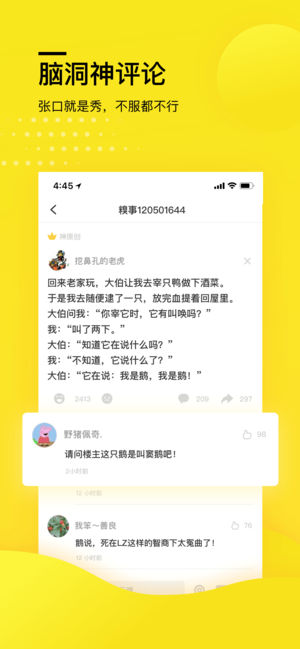 糗事百科,一个创始于 2005 年的“骨灰级”搞笑内容社区,专注“哈哈哈” 13 年,超过 2 亿戏精糗友在这里看笑料抖机灵,每年笑出来的腹肌连起来可以绕地球 2333 圈… (~ ̄▽ ̄)~ 我只说 3 点,你就会下载这个 App: -【笑料合集】原创段子内涵图、搞笑 GIF 短视频、聊天套路表情包… 每天海量内容更新,全网的笑点都在这儿! -【脑洞神评】戏精神评手,张口就是秀,不谦虚地说,扇贝听了都想鼓掌~ -【同城互撩】有颜又(bu)有(zheng)趣(jing)的人,就在你附近 :) -------- 「花大钱买的好评」 -------- 三好学生张小花:“科科满分的我一直…