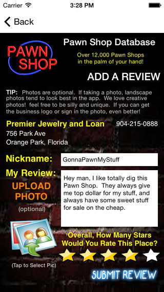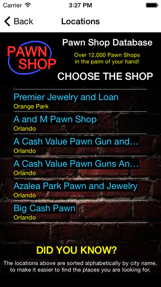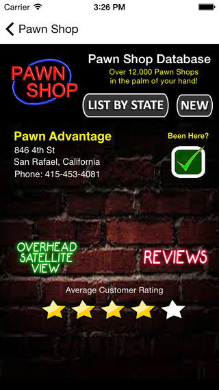 Pawn shop will automatically locate your current position and display all pawn shop located around you. The database currently has over 12,300 locations and is growing daily! Want to know the best place to sell or pawn your gold and silver? Simply load the app and all locations near you will be displayed. Tap on a location to get the pawn shop details, such as name, address, phone number, and even leave or read reviews from other users of the app!