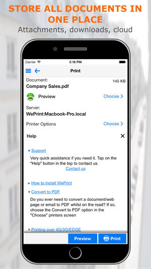 让所有打印机打印。无需其它软件,直接让多数 WiFi/无线打印机打印。通过您的 Mac/PC,让所有打印机打印任何类型的文档。当没有 WiFi 可用时,通过 3G 和公司/其它网络远程打印。在您的 iPhone 上查看、存储和打印电子邮件、文档、文件、附件、照片、联系人和网页。 全功能打印 * 通过您的 Mac 或 PC 让所有打印机(网络/WiFi/USB/蓝牙)打印,或者无需其它软件,直接连接到多数 WiFi 打印机进行打印。也可让 Apple AirPrint 打印机打印。 * USB 和蓝牙打印机可以和免费打印服务器软件(Windows 和 Mac)一起使用 * 通过 3G/…